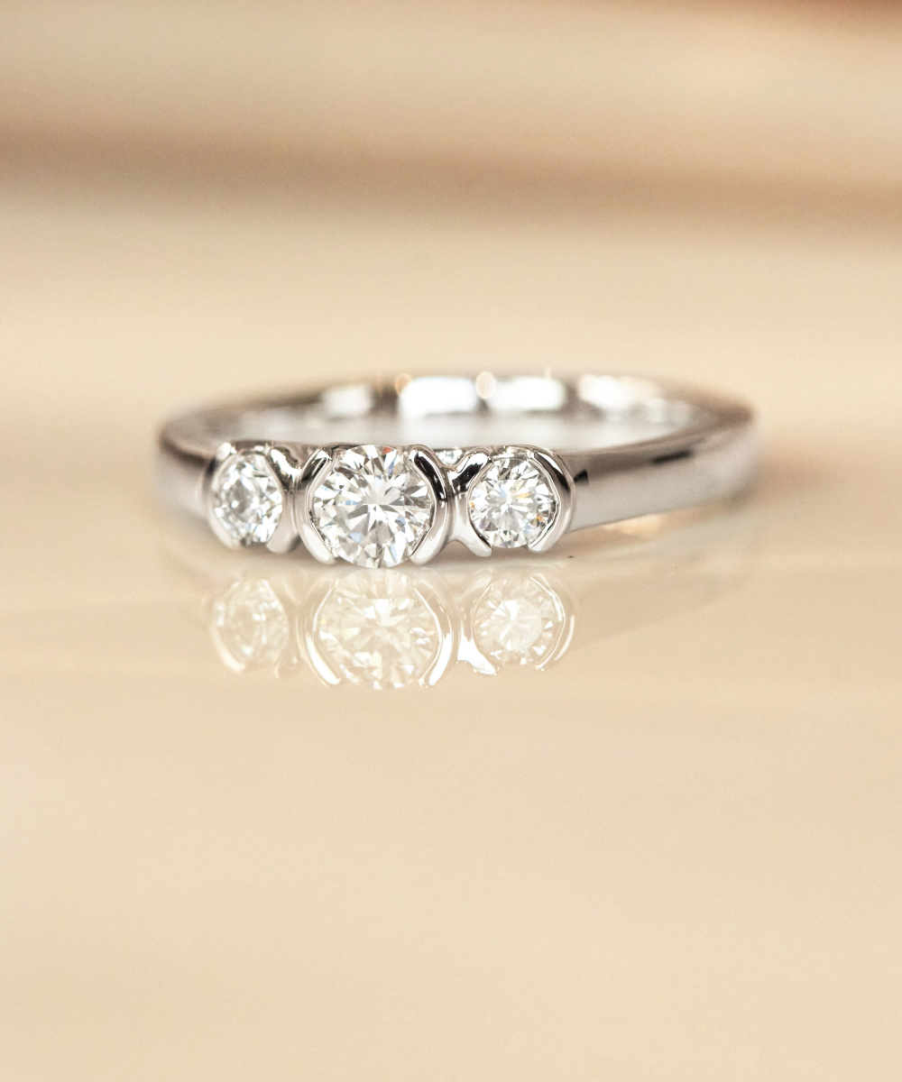 A unique Three Stone Diamond Engagement Ring, crafted in Platinum with our precise attention to detail. The gentle curves of the bar settings showcase the Round Brilliant Cut Diamonds beautifully.
