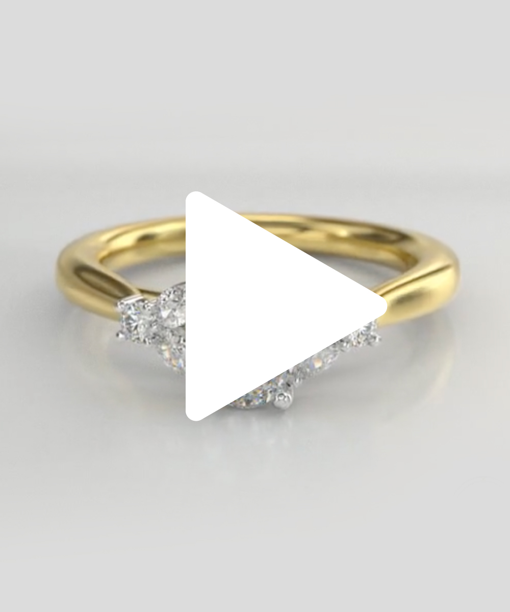 An unusual multi-stone Engagement Ring, crafted in 18ct Yellow Gold & Platinum with our precise attention to detail. The gentle curves and simple settings showcase the central 0.55ct Oval Cut Diamond beautifully, while the Pear and Round Brilliant Cut Diamonds to each side are inspired by leaves and the beauty of nature.