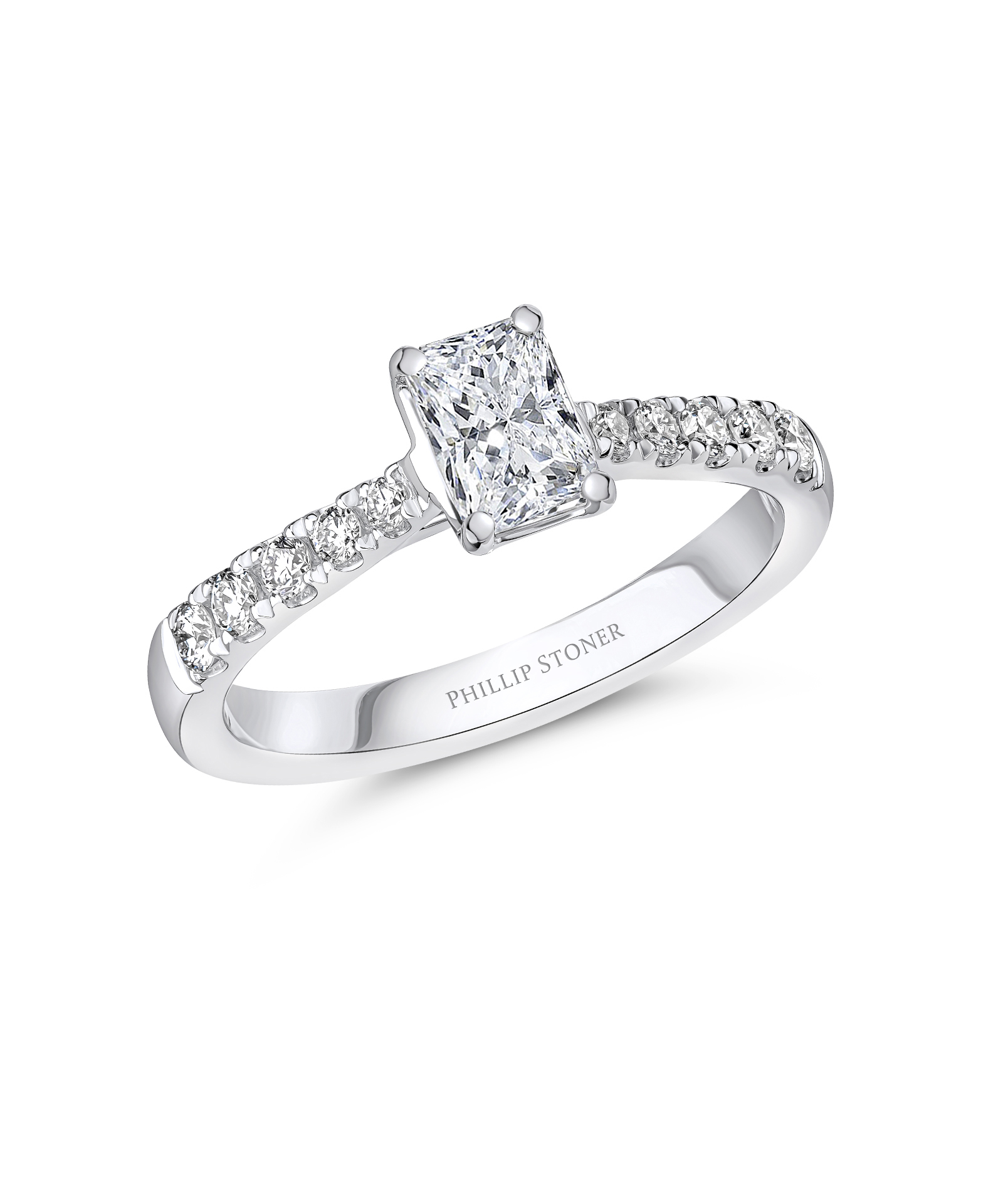 Platinum Solitaire Radiant Cut Diamond Engagement Ring, available at Phillip Stoner The Jeweller in Leeds & Manchester.