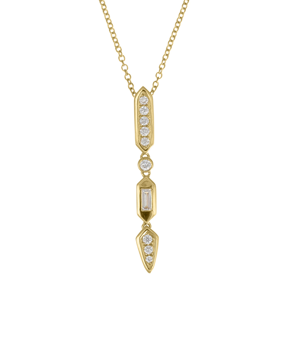 Round brilliant and baguette cut diamonds combine to create this beautiful pendant, inspired by jewellery from the Art Deco era.