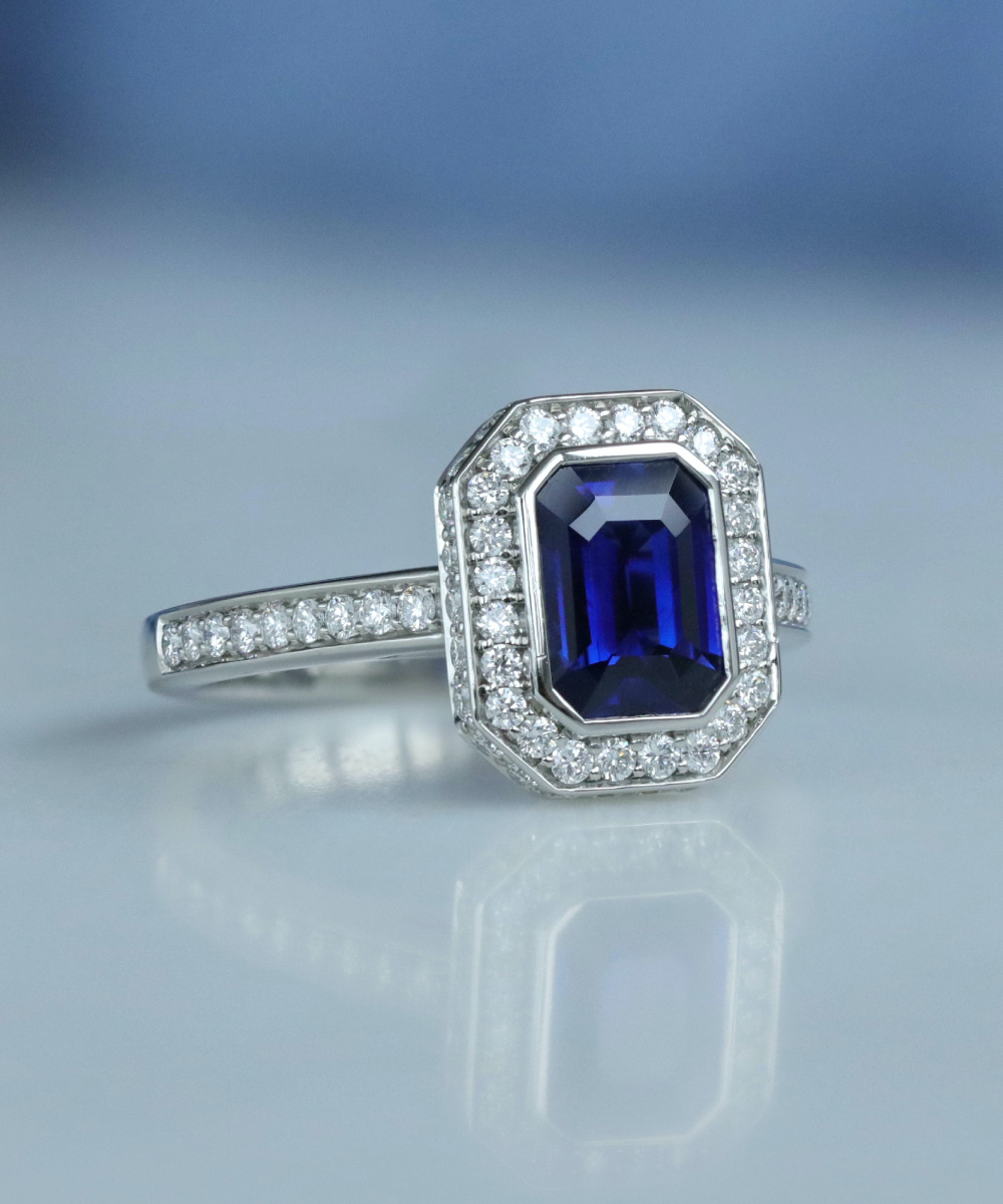 Inspired by the angular lines of Art Deco jewellery, this Platinum ring features a stunning 1.29ct Emerald Cut Sapphire, enhanced by rows of bright white Round Brilliant Cut Diamonds.